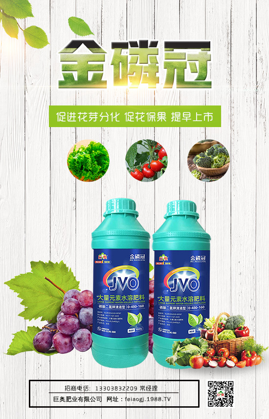 巨奧肥業(yè)有限公司【大量元素水溶肥料0-480-160-金磷冠】有效促進(jìn)光合作用和增加樹體的養(yǎng)分積累,促進(jìn)葡萄花芽分化,提高葡萄開花座果,提早上市,提高經(jīng)濟效益。